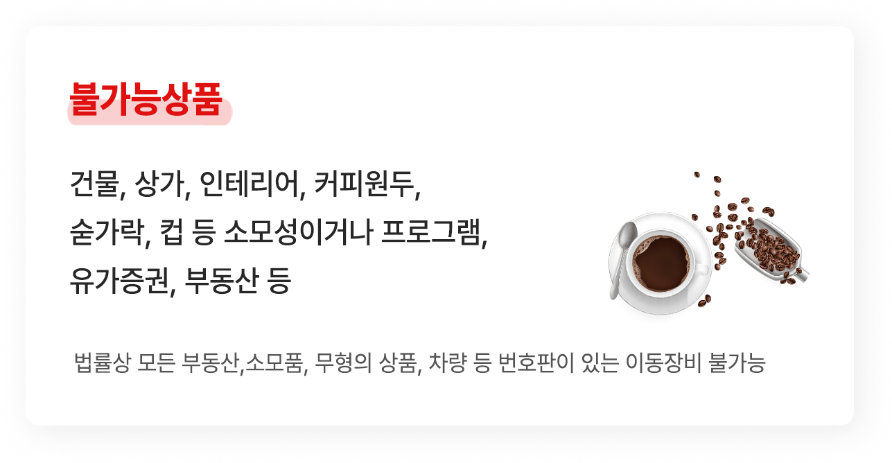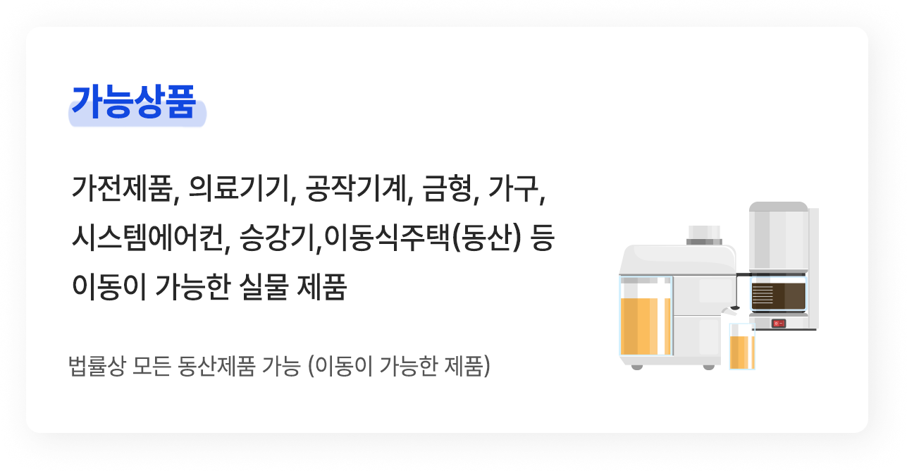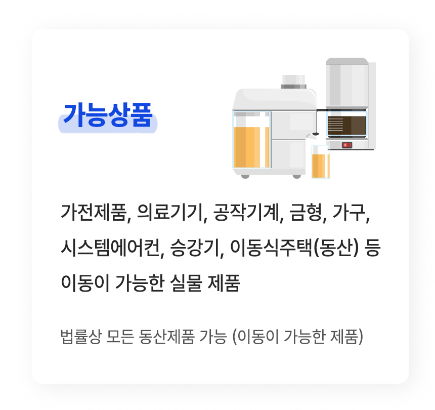 ◾ 소모성 장비가 아닌 동산으로 잡히는 상품은 모두 가능하고 제품 리스트 보내주시면 확인해 드리겠습니다.