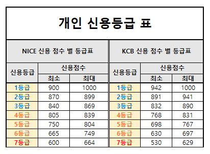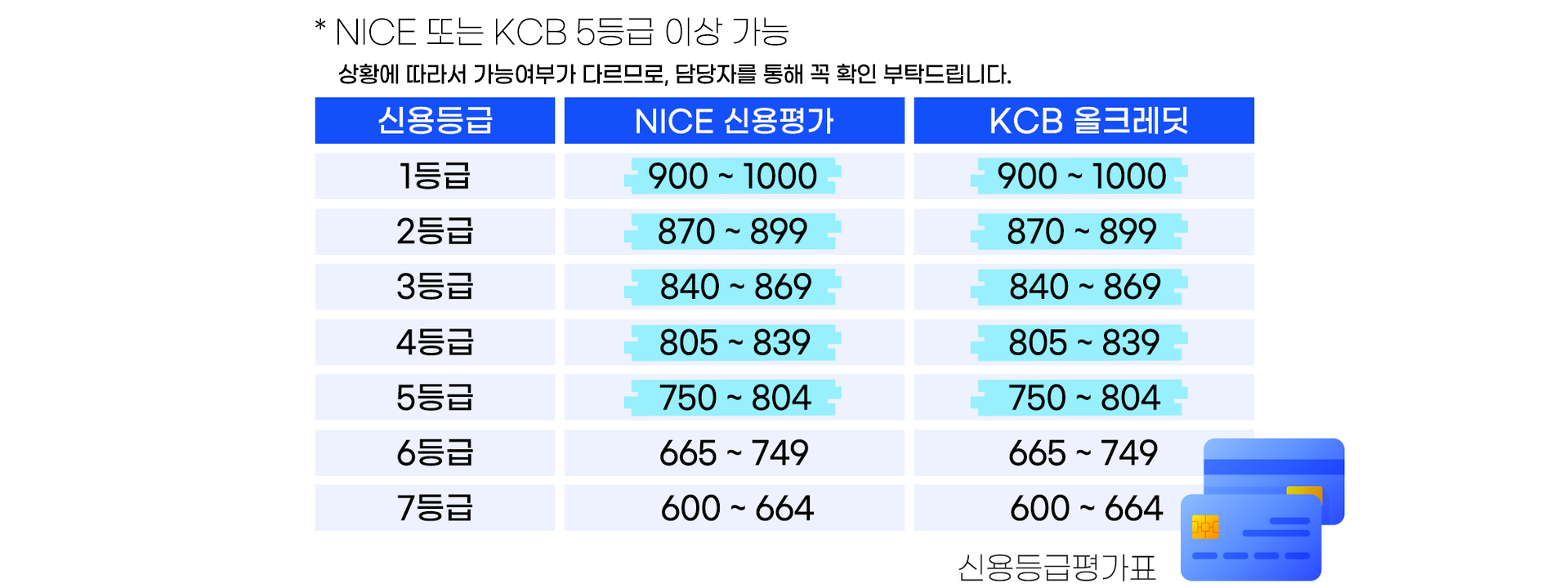 ◾ 신용등급은 KCB와 NICE 두 가지가 있으면 아래의 표와 같으며 최소 5등급 이상이면 접수 가능하시고 6등급은 상황에 따라서 가능 여부 확인 후 접수 진행이 가능합니다.